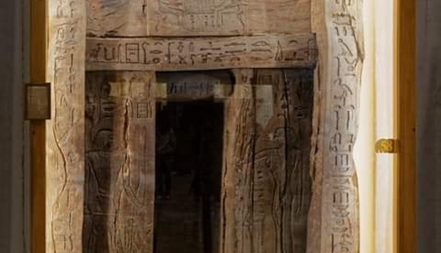 The function of the imaginary door in the tombs of the state’s seniors in ancient Egypt is to facilitate the exit and entry of the ka, and a photographer at the door is the priest Aika on the left side, and with him, he took his sons.