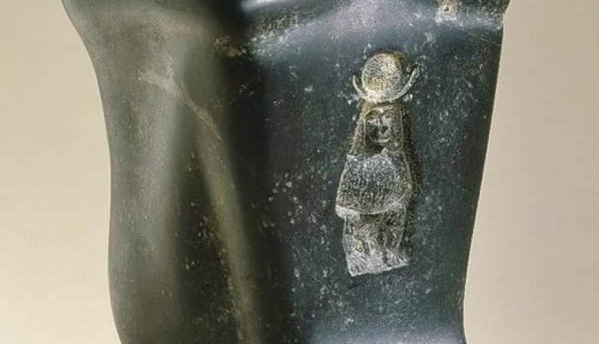 This statue belongs to Senusret, one of the nobles of the Middle Kingdom, especially the late 12th Dynasty, perhaps from the reign of King Senusret III or his successor, Amenemhat III, and the statue’s owner appears in the official body, where he wears a wig of medium length with a rounded bottom, and includes his legs to his chest and straightens his arms On her, he wears an interwoven robe that wraps most parts of his body, leaving only the feet visible. The artist took advantage of the spaces f the robe and inscribed on him the names and titles of the statue’s owner. We find he begged the deity “Ptah Sukkar” in the inscriptions, and the features of his face follow the southern Tayyibi school. Itneferuseneb is between his feet in a small size, and the inscriptions did not indicate the woman’s relationship to the owner of the statue. Still, this shape was common among husbands, and this is not an underestimation of his wife’s appearance between his feet with the size of a sir. Still, it is an honour and honour for her, where the husband wants to send with him In the other world, accompanying him, and appearing as if he was surrounding her and working to protect her. The wife wears a long, narrow knit robe that shows the details of the body from below and a long hair wig and features a realistic figure that also belongs to the Southern School. The statue expresses The spread of the idea of statues block in the era of the Middle Kingdom.